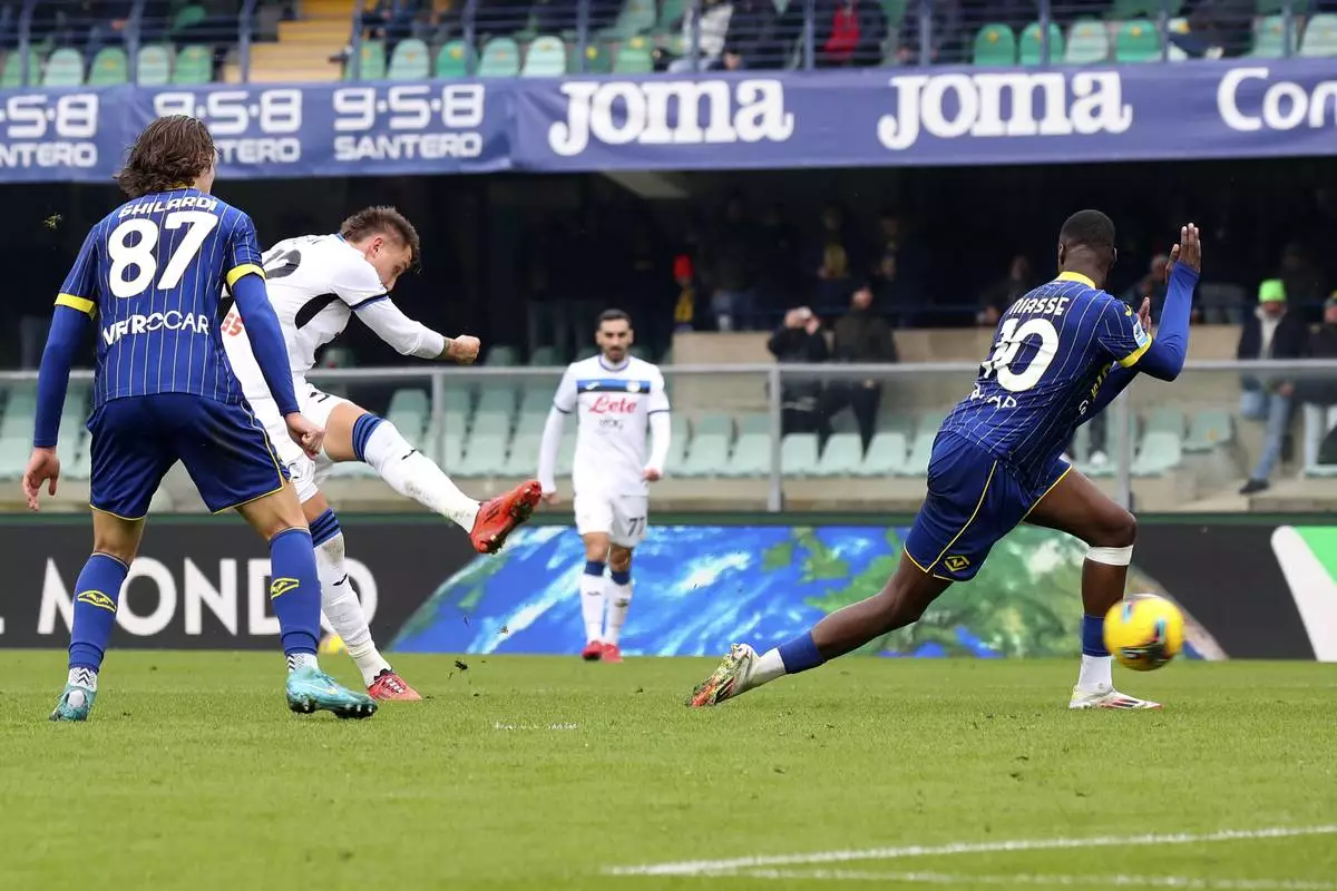 Atalanta's Mateo Retegui scores during the Serie A soccer match between Hellas Verona and Atalanta at the Marcantonio Bentegodi Stadium, Verona, Italy, Saturday, Feb. 8 2025. (Paola Garbuio/LaPresse via AP)