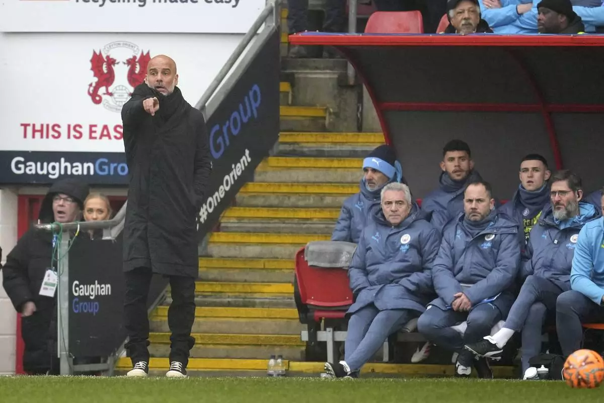 Manchester City's head coach Pep Guardiola, left, gives instructions from the side line during the English FA Cup fourth round soccer match between Leyton Orient and Manchester City at the Gaughan Group Stadium in London, England, Saturday, Feb. 8, 2025. (AP Photo/Kin Cheung)