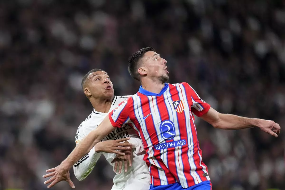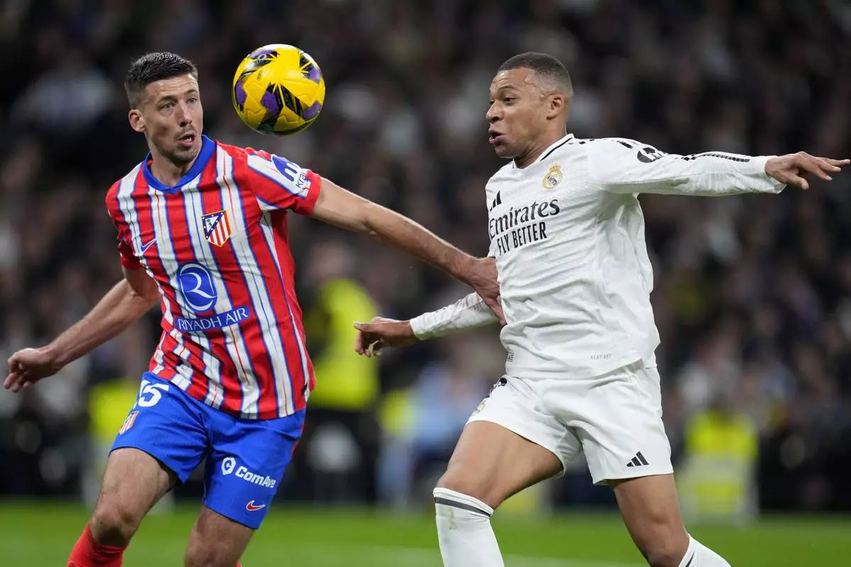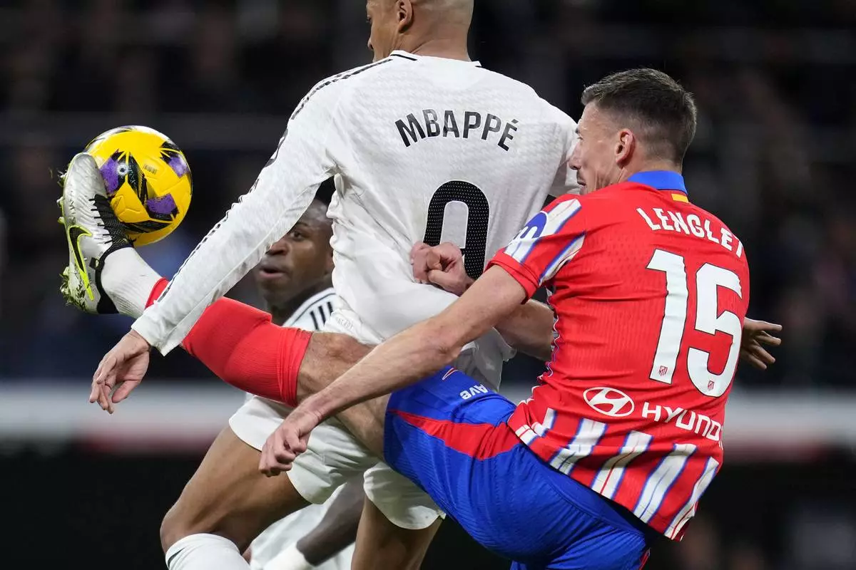 Atletico Madrid's Clement Lenglet, right, vies for the ball with Real Madrid's Kylian Mbappe during a Spanish La Liga soccer match between Real Madrid and Atletico Madrid at the Santiago Bernabeu stadium in Madrid, Saturday, Feb. 8, 2025. (AP Photo/Manu Fernandez)