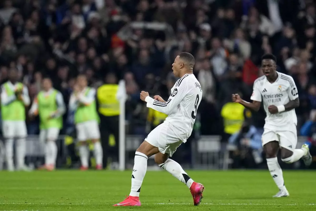 Real Madrid's Kylian Mbappe celebrates after scoring his side's first goal during a Spanish La Liga soccer match between Real Madrid and Atletico Madrid at the Santiago Bernabeu stadium in Madrid, Saturday, Feb. 8, 2025. (AP Photo/Manu Fernandez)