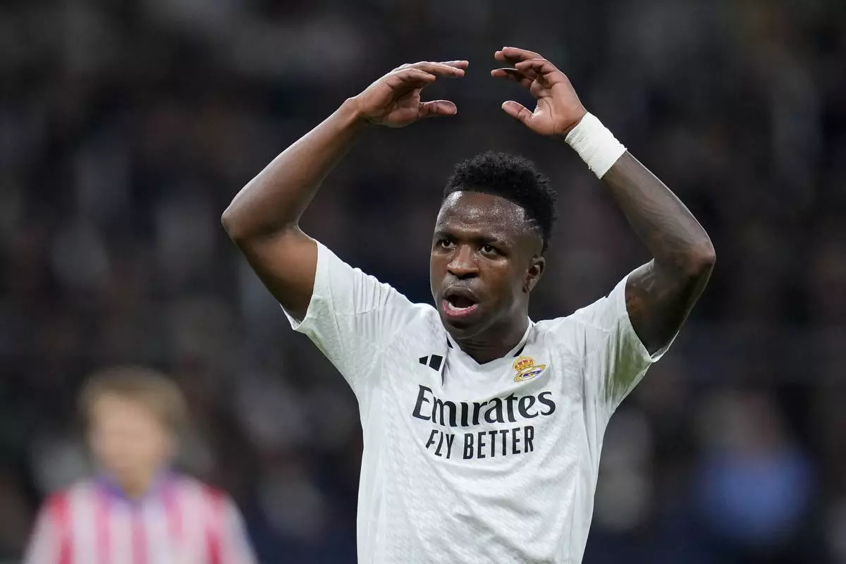 Real Madrid's Vinicius Junior reacts after a failed attempt to score during a Spanish La Liga soccer match between Real Madrid and Atletico Madrid at the Santiago Bernabeu stadium in Madrid, Saturday, Feb. 8, 2025. (AP Photo/Manu Fernandez)