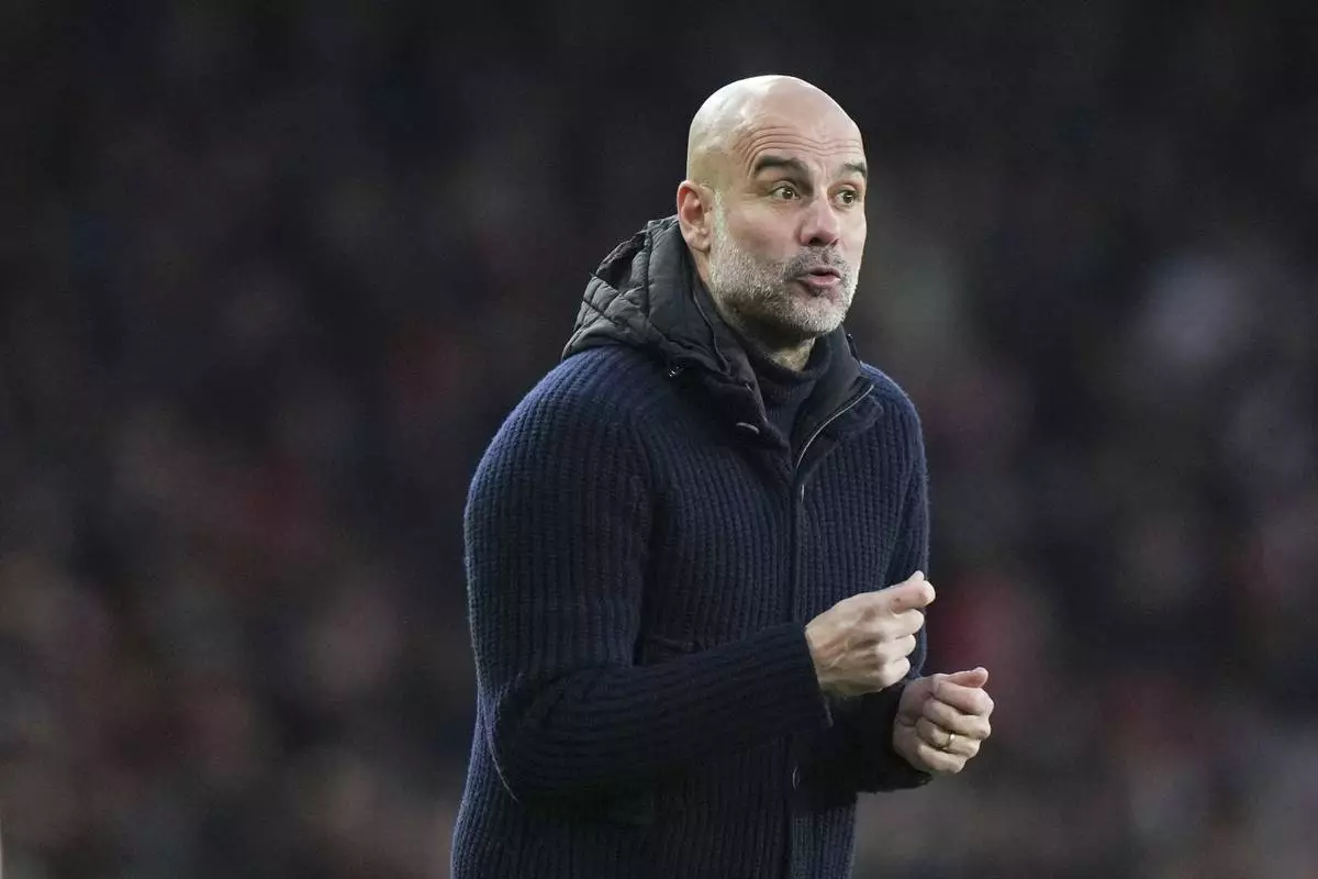 Manchester City's head coach Pep Guardiola gestures during the English Premier League soccer match between Arsenal and Manchester City at the Emirates stadium in London, Sunday, Feb. 2, 2025. (AP Photo/Alastair Grant)