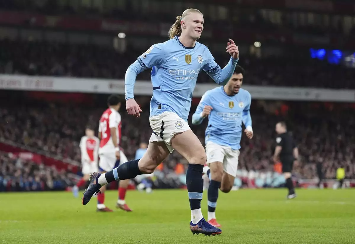 Manchester City's Erling Haaland celebrates scoring his side's first goal during the English Premier League soccer match between Arsenal and Manchester City at the Emirates stadium in London, Sunday, Feb. 2, 2025. (Adam Davy/PA via AP)