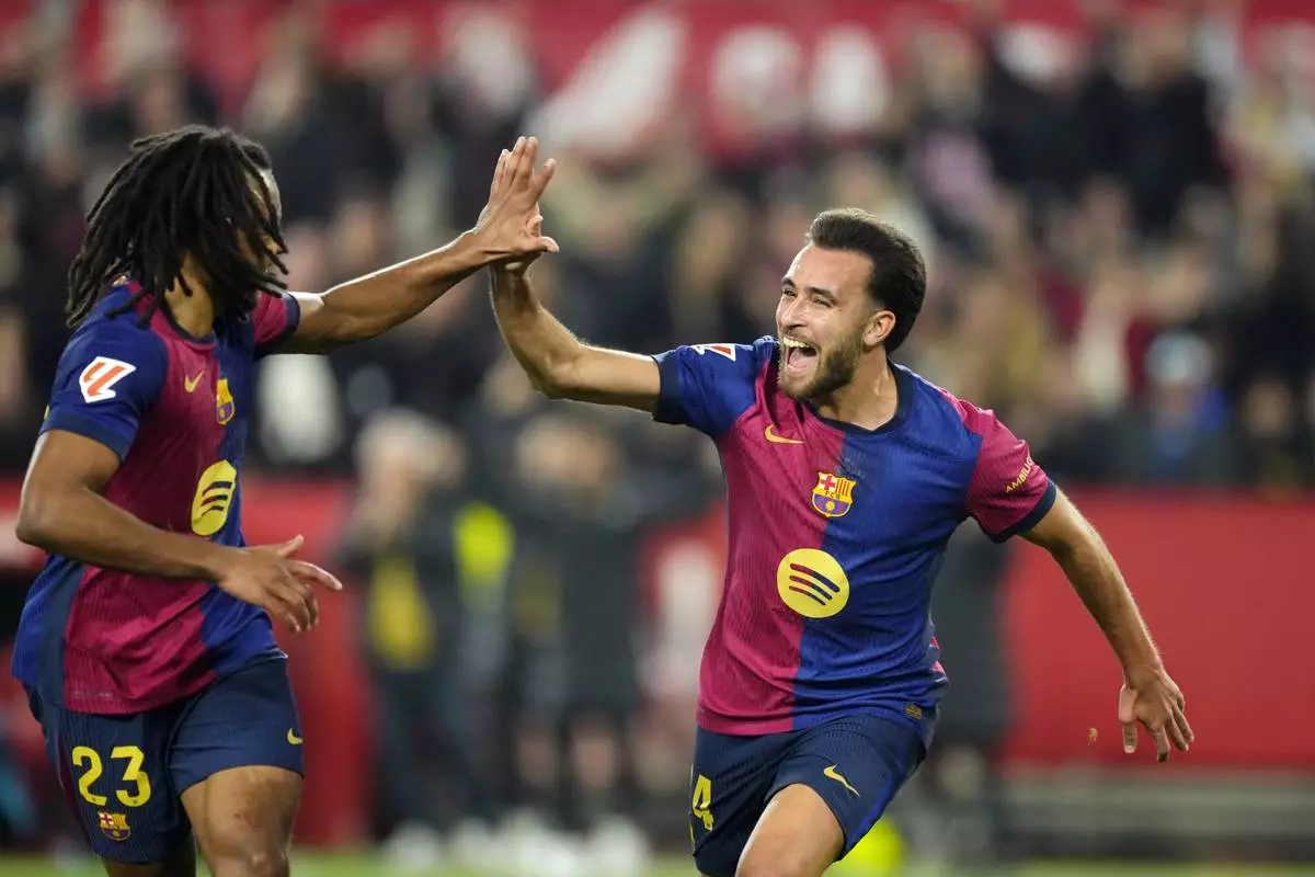 Barcelona's Eric Garcia celebrates with Jules Kounde, left, after scoring his side's fourth goal during a Spanish La Liga soccer match between Sevilla and FC Barcelona at the Ramon Sanchez Pizjuan stadium in Seville, Spain, Sunday, Feb. 9, 2025. (AP Photo/Jose Breton)