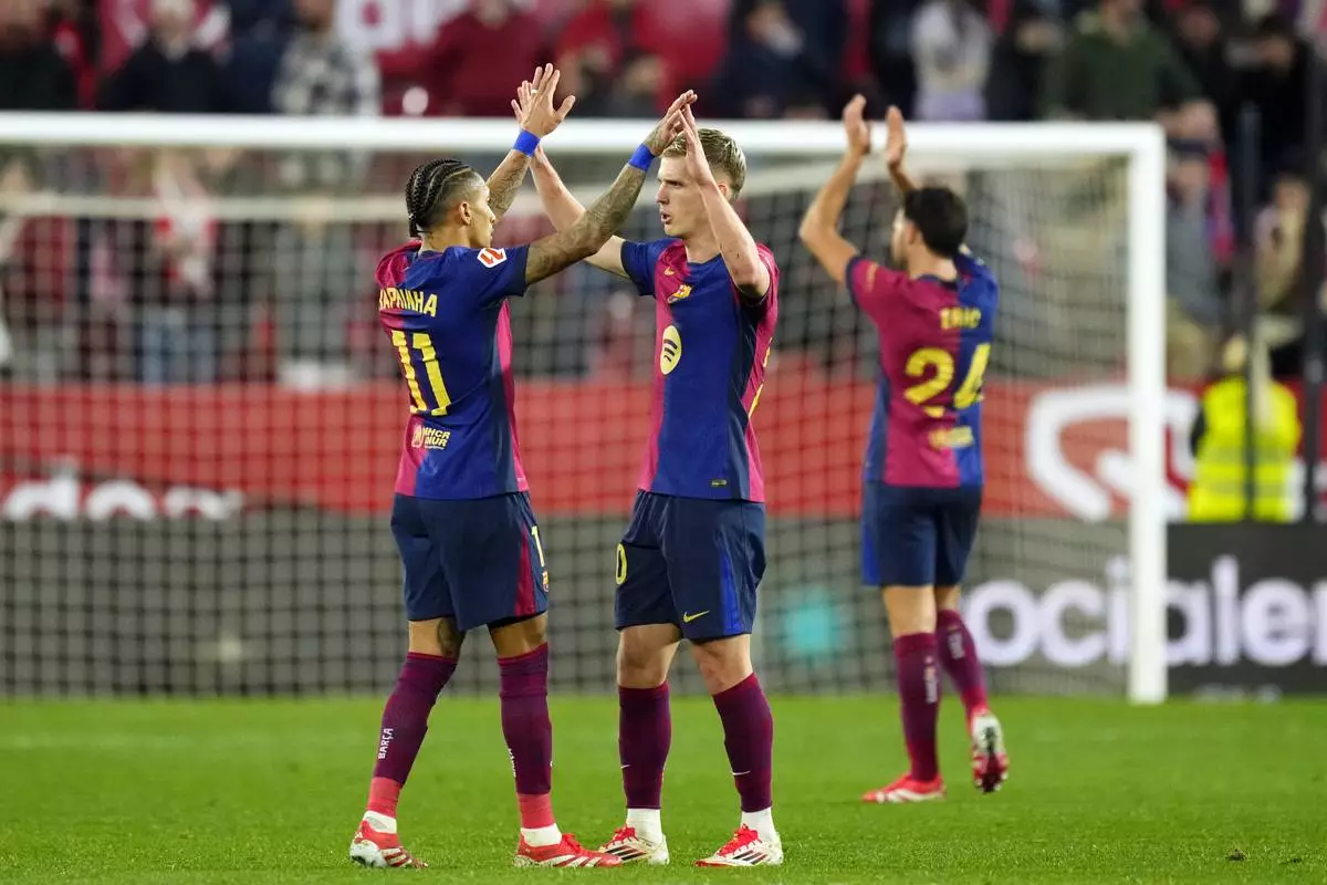 Barcelona's Raphinha, left, and Dani Olmo celebrate at the end of a Spanish La Liga soccer match between Sevilla and FC Barcelona at the Ramon Sanchez Pizjuan stadium in Seville, Spain, Sunday, Feb. 9, 2025. (AP Photo/Jose Breton)