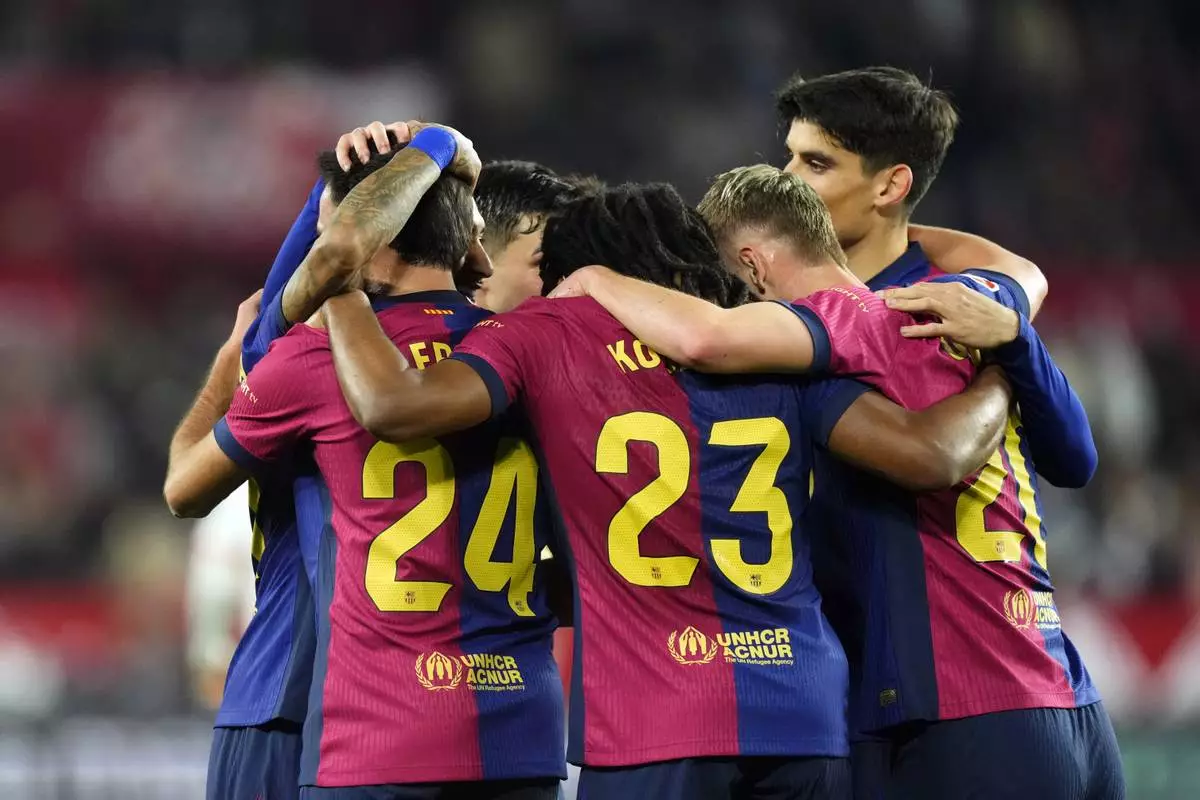 Barcelona's Eric Garcia, foreground left, celebrates with his teammates after scoring his side's fourth goal during a Spanish La Liga soccer match between Sevilla and FC Barcelona at the Ramon Sanchez Pizjuan stadium in Seville, Spain, Sunday, Feb. 9, 2025. (AP Photo/Jose Breton)