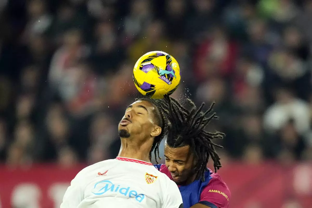 Sevilla's Loic Bade jumps for the ball with Barcelona's Jules Kounde, right, during a Spanish La Liga soccer match between Sevilla and FC Barcelona at the Ramon Sanchez Pizjuan stadium in Seville, Spain, Sunday, Feb. 9, 2025. (AP Photo/Jose Breton)