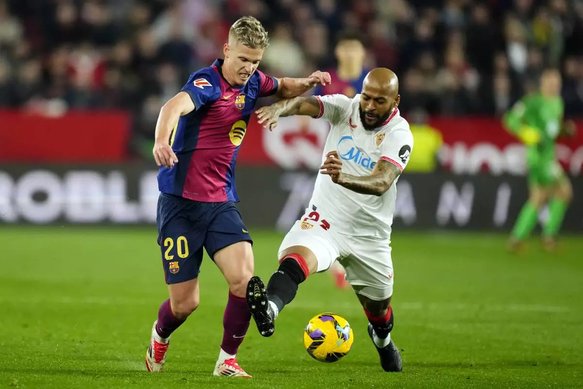 Sevilla's Marcao vies for the ball with Barcelona's Dani Olmo, left, during a Spanish La Liga soccer match between Sevilla and FC Barcelona at the Ramon Sanchez Pizjuan stadium in Seville, Spain, Sunday, Feb. 9, 2025. (AP Photo/Jose Breton)