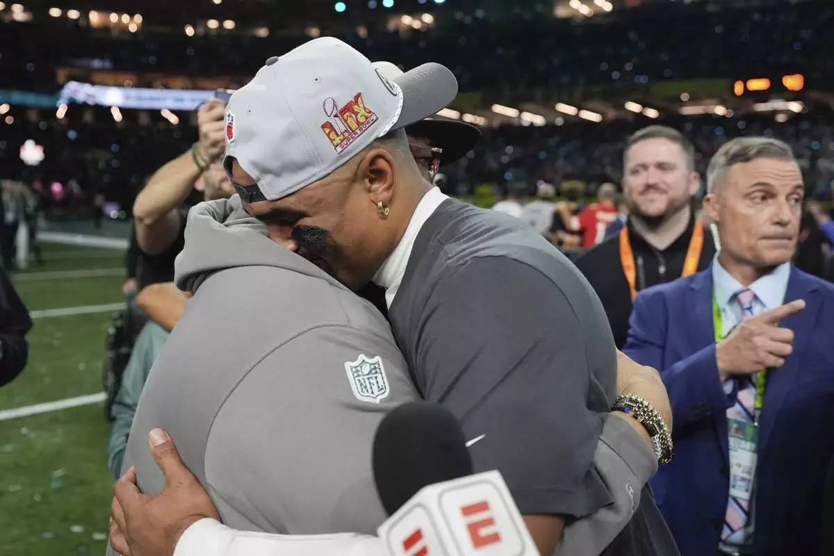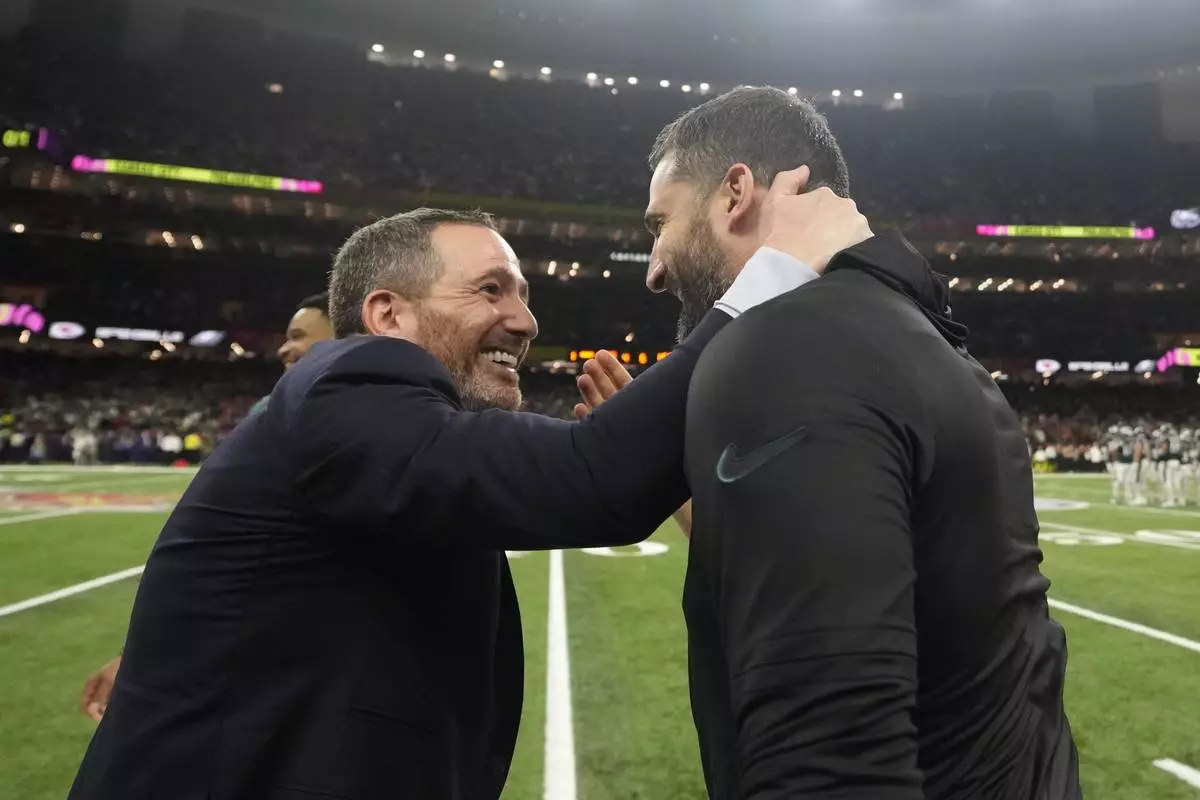 Philadelphia Eagles general manager Howie Roseman, left, celebrates with head coach Nick Sirianni during the second half of the NFL Super Bowl 59 football game against the Kansas City Chiefs, Sunday, Feb. 9, 2025, in New Orleans. (AP Photo/Brynn Anderson)