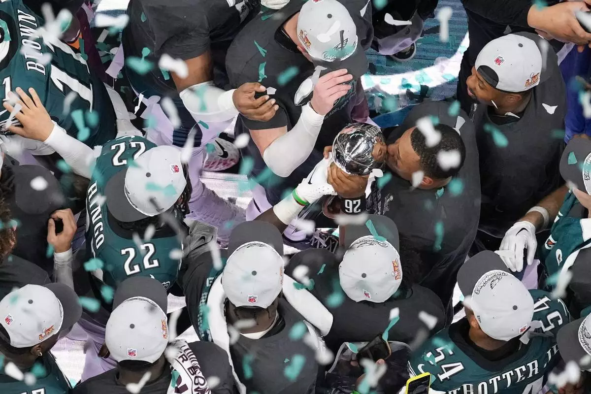 Member of the Philadelphia Eagles celebrate after defeating the Kansas City Chiefs during the NFL Super Bowl 59 football game, Sunday, Feb. 9, 2025, in New Orleans. (AP Photo/Abbie Parr)
