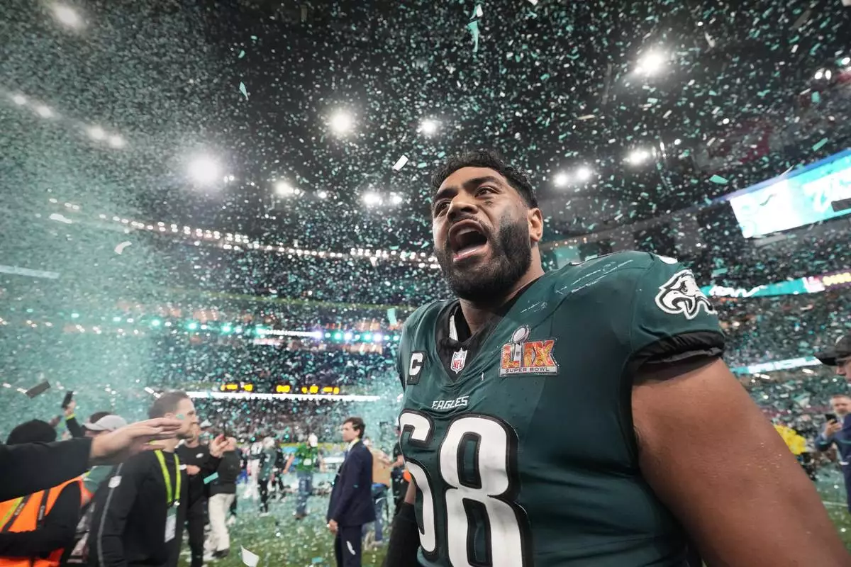 Philadelphia Eagles tackle Jordan Mailata celebrates after defeating the Kansas City Chiefs in the NFL Super Bowl 59 football game, Sunday, Feb. 9, 2025, in New Orleans. (AP Photo/Doug Benc)