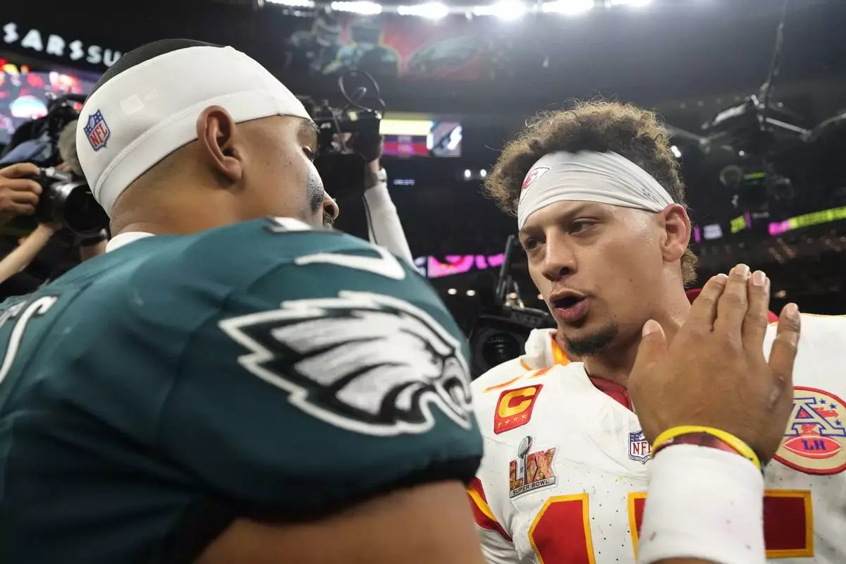 Kansas City Chiefs quarterback Patrick Mahomes, right, greets Philadelphia Eagles quarterback Jalen Hurts after the NFL Super Bowl 59 football game, Sunday, Feb. 9, 2025, in New Orleans. (AP Photo/Brynn Anderson)