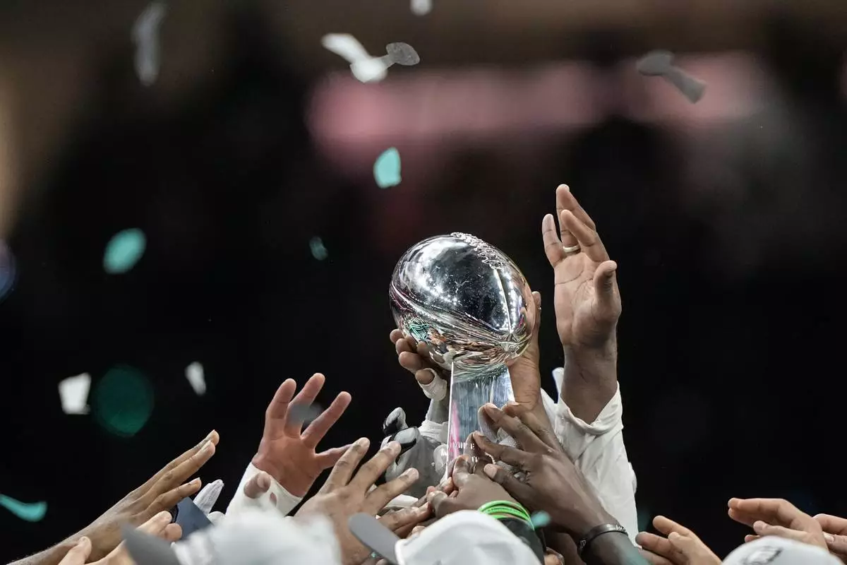 Philadelphia Eagles players celebrate with the Vince Lombardi Trophy after the Eagles won the NFL Super Bowl 59 football game against the Kansas City Chiefs, Sunday, Feb. 9, 2025, in New Orleans. (AP Photo/David J. Phillip)