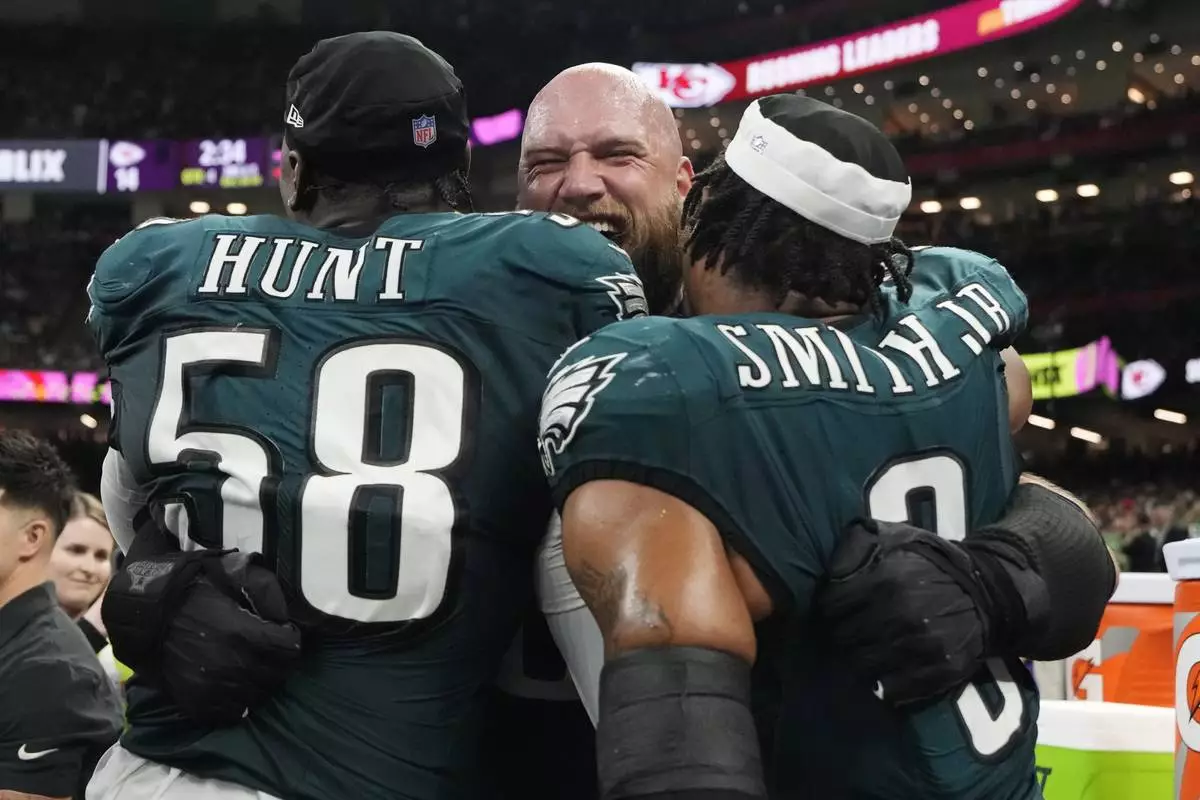 Philadelphia Eagles offensive tackle Lane Johnson, center, celebrates with linebacker Jalyx Hunt (58) and linebacker Nolan Smith Jr. (3) during the second half of the NFL Super Bowl 59 football game against the Kansas City Chiefs, Sunday, Feb. 9, 2025, in New Orleans. (AP Photo/Brynn Anderson)