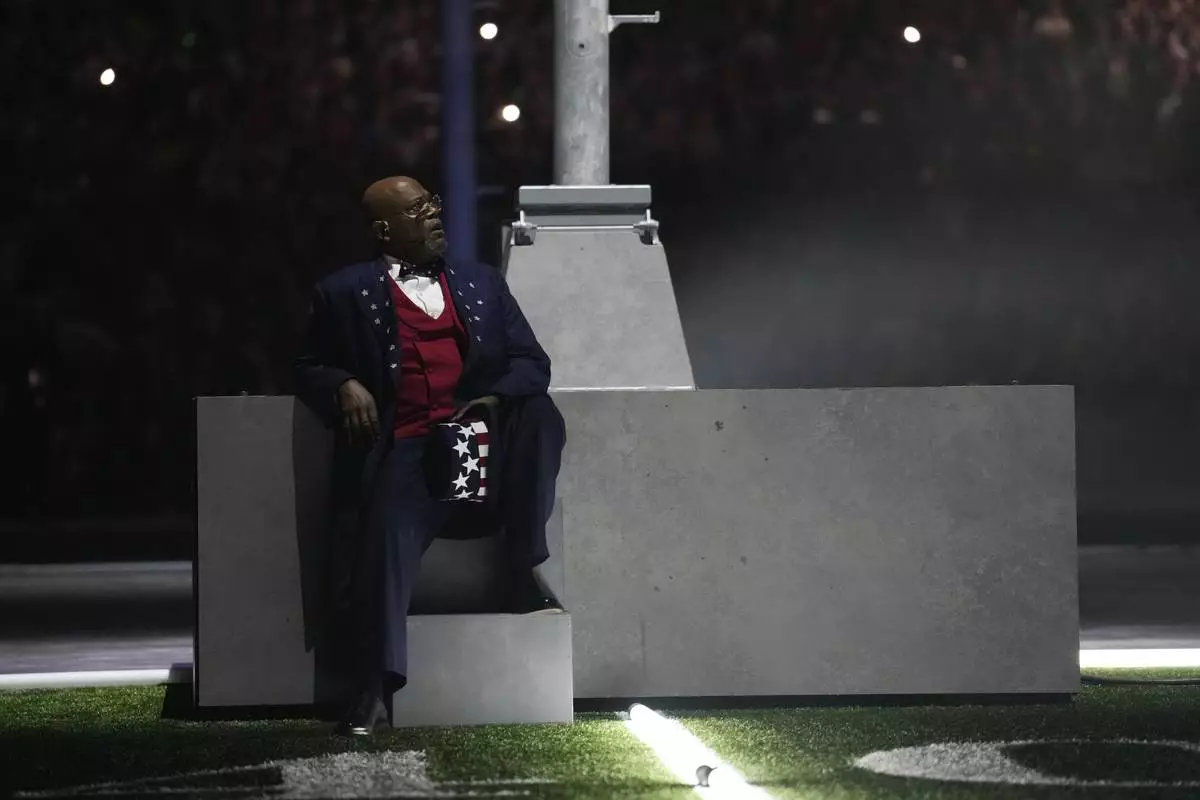 Samuel L. Jackson watches during halftime of the NFL Super Bowl 59 football game between the Kansas City Chiefs and the Philadelphia Eagles, Sunday, Feb. 9, 2025, in New Orleans. (AP Photo/Ashley Landis)