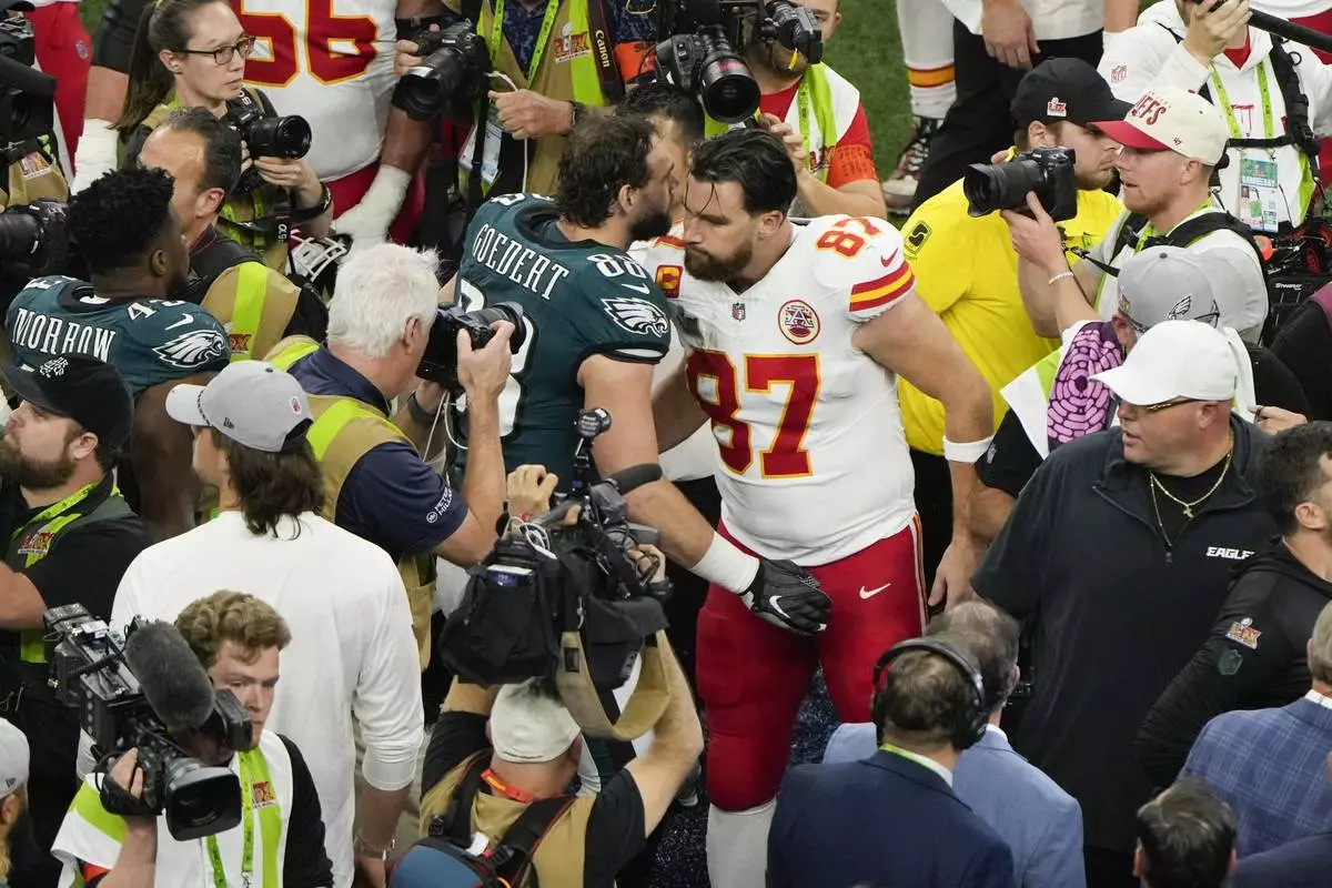 Philadelphia Eagles tight end Dallas Goedert (88) and Kansas City Chiefs tight end Travis Kelce (87) greet each other after the NFL Super Bowl 59 football game, Sunday, Feb. 9, 2025, in New Orleans. (AP Photo/Charlie Riedel)