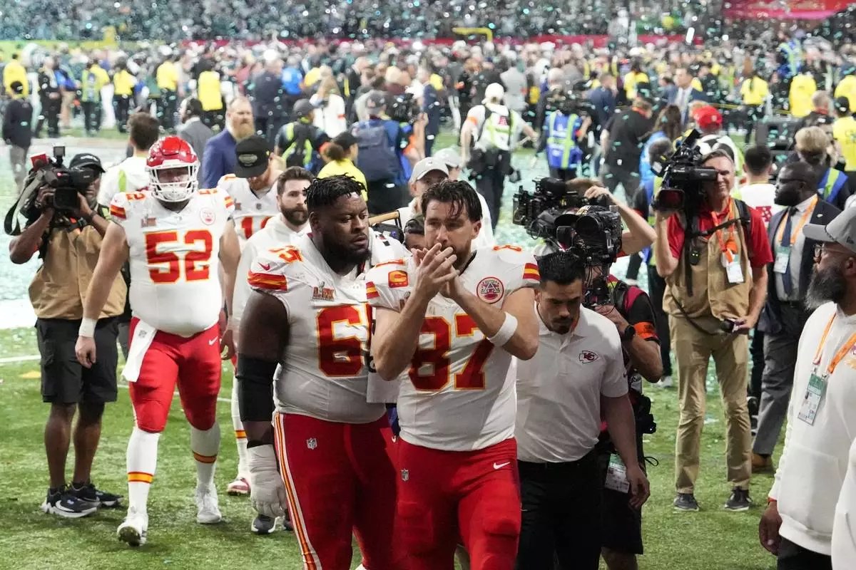 Kansas City Chiefs tight end Travis Kelce (87) leaves the field with teammates after the first half of the NFL Super Bowl 59 football game against the Philadelphia Eagles, Sunday, Feb. 9, 2025, in New Orleans. (AP Photo/David J. Phillip)