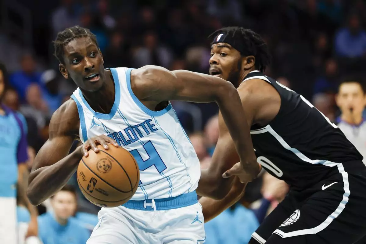 Charlotte Hornets forward Moussa Diabate, left, drives past Brooklyn Nets center Day'Ron Sharpe during the first half of an NBA basketball game in Charlotte, N.C., Wednesday, Jan. 29, 2025. (AP Photo/Nell Redmond)