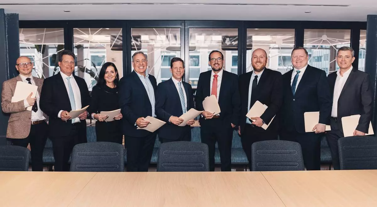 Drees & Sommer joins forces with VVA (from left to right): Kenneth Wood (Managing Director of Drees & Sommer UK and Partner of Drees & Sommer), Lorenzo Vascotto (Founding Member and Partner of VVA), Dana Panzarino (Partner of VVA), Marc D. Chiapperino (Partner of VVA), Philipp Späth (Partner of Drees & Sommer), Steffen Szeidl (Chief Executive Officer and Partner of Drees & Sommer), Adam Kavanagh (Partner of VVA), Chris Petryshin (Partner of VVA) and Kevin Gold (Partner of VVA) © VVA – Part of Drees & Sommer, Drees & Sommer (Photo: Business Wire)