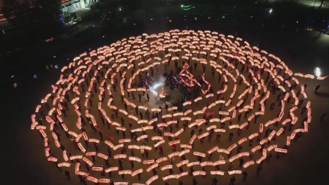 The villagers paraded through the village streets before gathering in a square to form multiple concentric circles, with the dragon swirling around the center in a dazzling field of lanterns under the night sky.