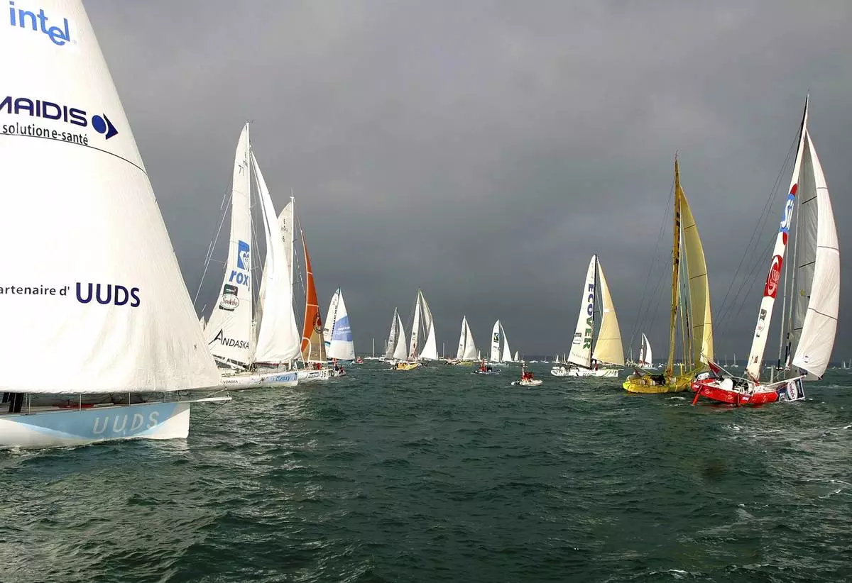 FILE - Yachts take part at the start of the Vendee Globe Challenge round-the-world solo sailing race at Les Sables D'Olonne, western France, Nov. 7, 2004. (AP Photo/Franck Prevel, File)