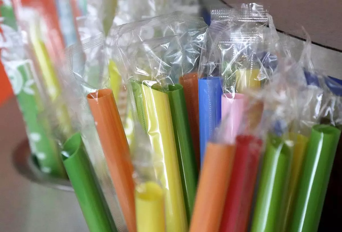 FILE - Wrapped plastic straws are seen at a bubble tea cafe in San Francisco, July 17, 2018. (AP Photo/Jeff Chiu, File)