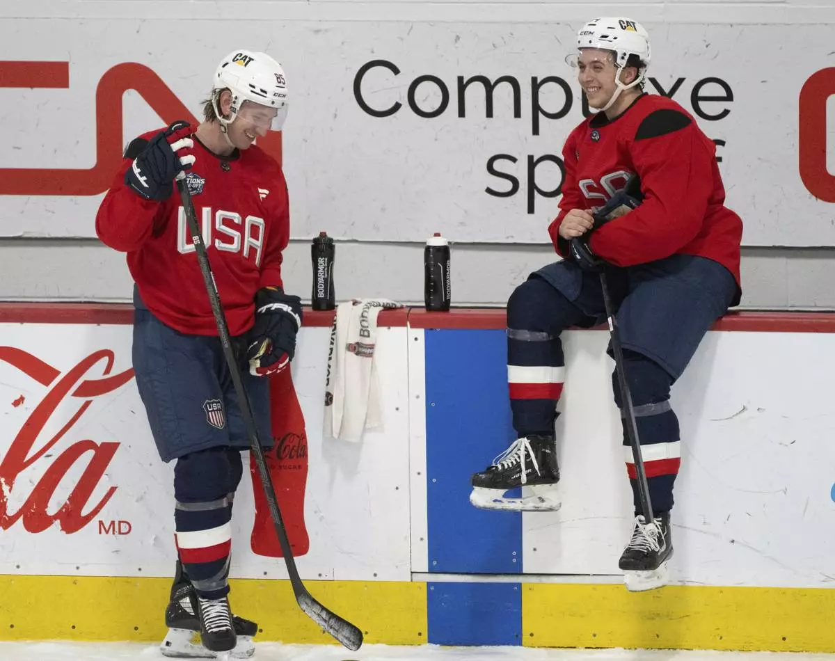 U.S. players Jake Sanderson, left and Brock Faber talk during a 4 Nations Face-Off hockey practice in Brossard, Que., on Monday, Feb. 10, 2025. (Christinne Muschi/The Canadian Press via AP)