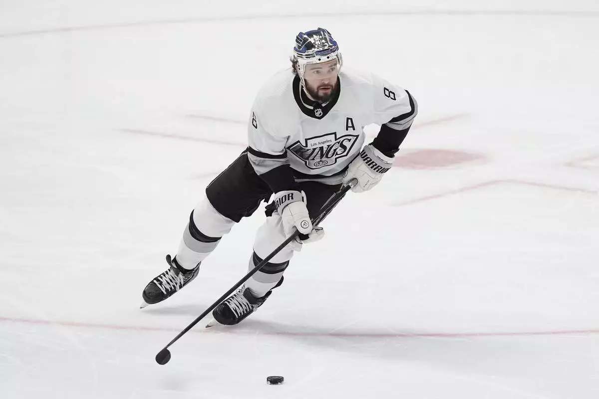 FILE - Los Angeles Kings defenseman Drew Doughty (8) skates with the puck during the first period an NHL hockey game against the Dallas Stars in Dallas, March 16, 2024. (AP Photo/LM Otero, File)