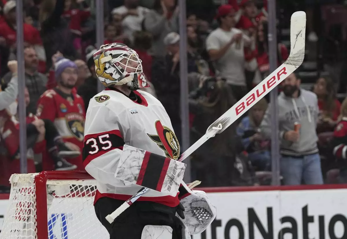 Ottawa Senators goaltender Linus Ullmark (35) looks at the scoreboard after Florida Panthers center Sam Bennett scored a goal during the second period of an NHL hockey game Saturday, Feb. 8, 2025, in Sunrise, Fla. (AP Photo/Lynne Sladky)