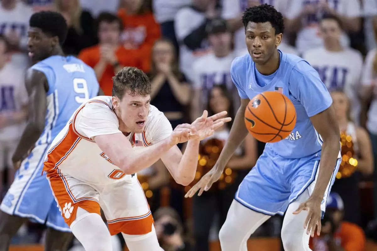 Clemson center Viktor Lakhin (0) passes the ball away from North Carolina forward Jalen Washington, right, during the first half of an NCAA college basketball game Monday, Feb. 10, 2025, in Clemson, S.C. (AP Photo/Scott Kinser)
