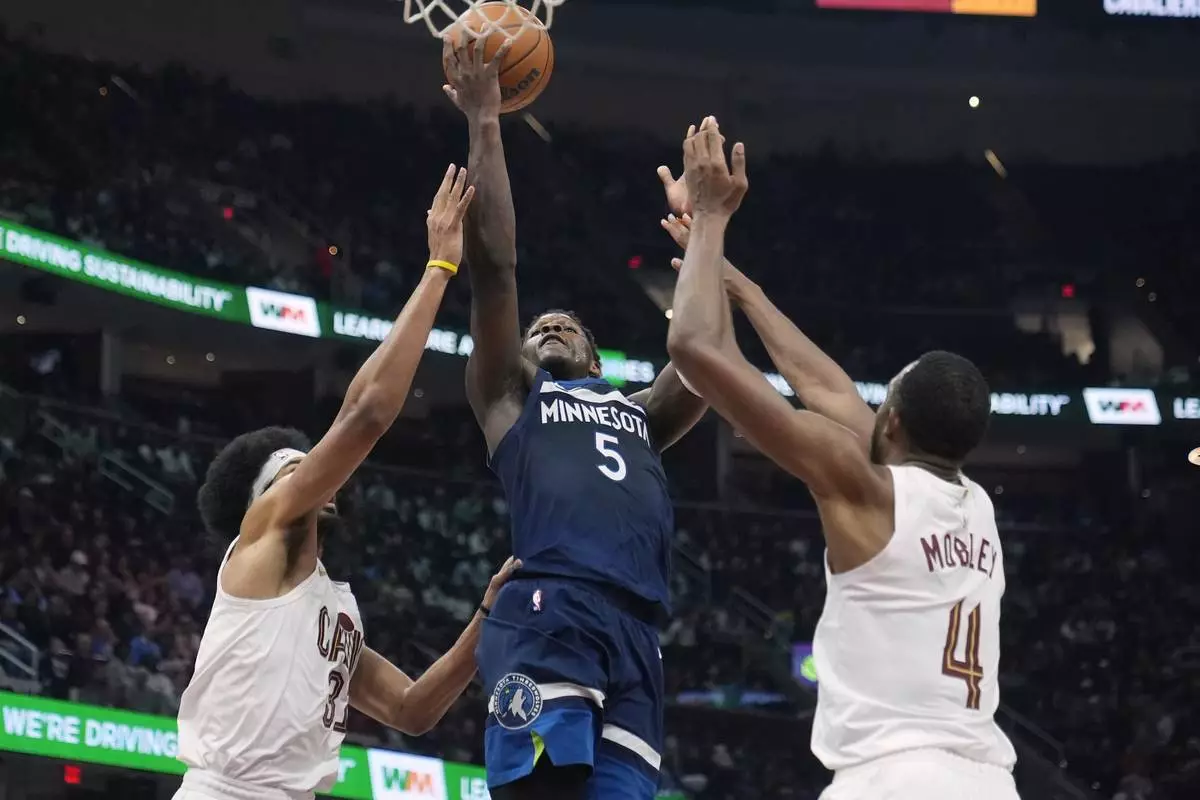 Minnesota Timberwolves guard Anthony Edwards (5) shoots between Cleveland Cavaliers center Jarrett Allen (31) and forward Evan Mobley (4) in the first half of an NBA basketball game Monday, Feb. 10, 2025, in Cleveland. (AP Photo/Sue Ogrocki)