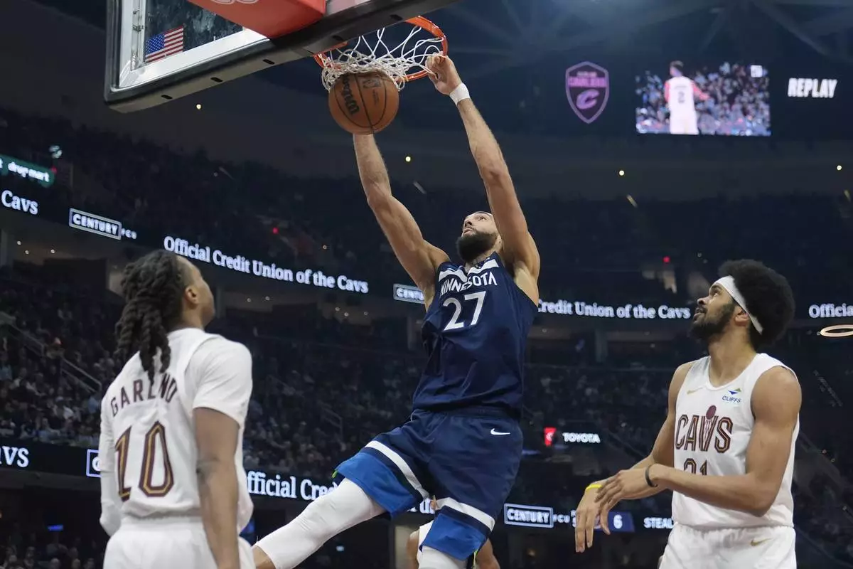 Minnesota Timberwolves center Rudy Gobert (27) dunks between Cleveland Cavaliers guard Darius Garland (10) and center Jarrett Allen, right, in the first half of an NBA basketball game Monday, Feb. 10, 2025, in Cleveland. (AP Photo/Sue Ogrocki)