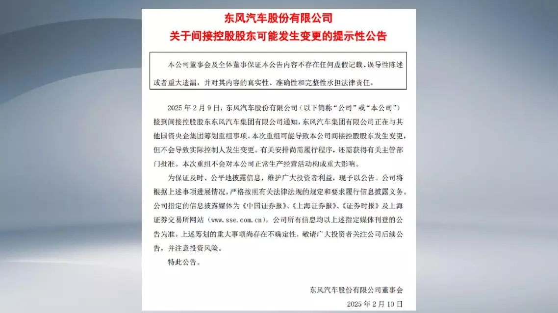Dongfeng Automobile said in a filing that its indirect controlling shareholder Dongfeng Motor Corp is planning a restructuring with other central SOEs, which could result in a change in its indirect controlling shareholder, without affecting its actual controller.