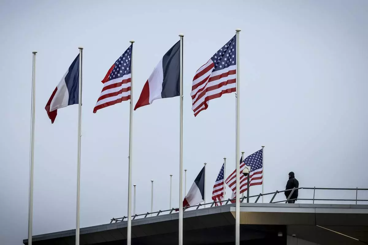French and American flags flap in the wind prior to the arrival of United States Vice-President JD Vance at Paris Orly Airport, ahead of an Artificial Intelligence Action Summit taking place in Paris, Monday, Feb. 10, 2025. (AP Photo/Thomas Padilla)