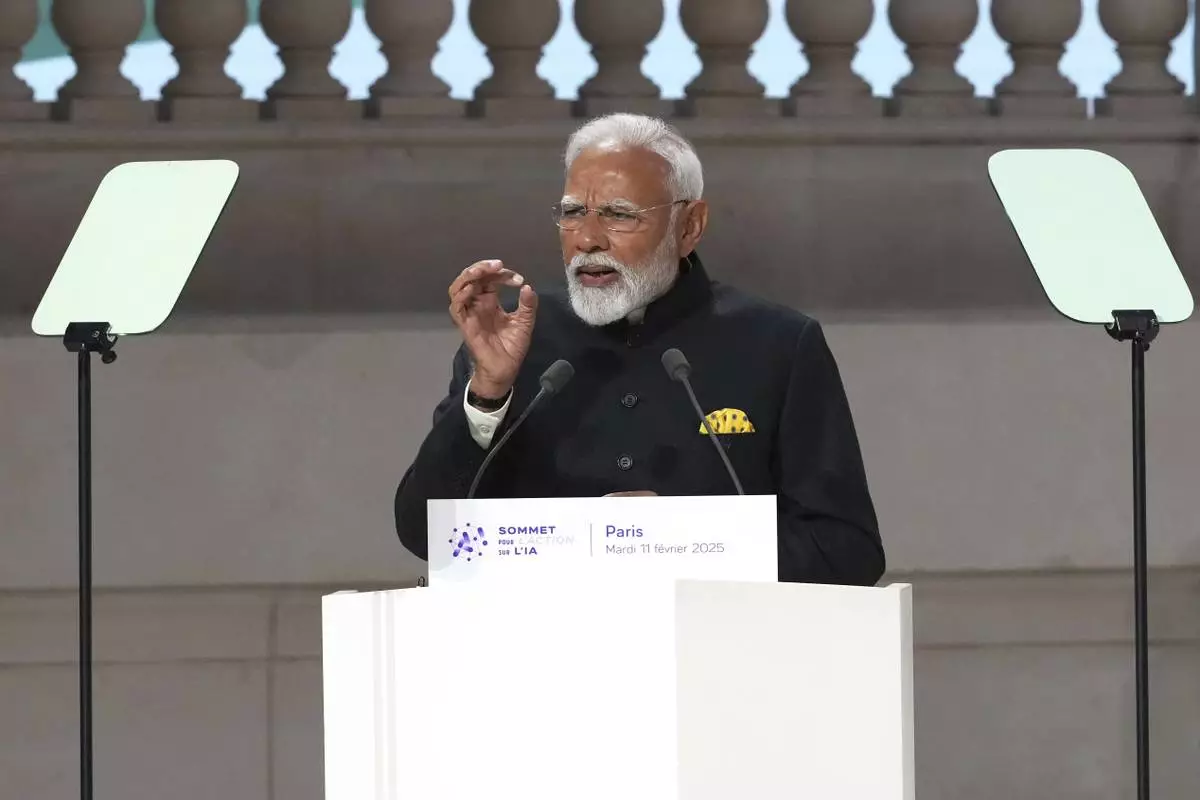 India's Prime Minister Narendra Modi addresses the audience at the Grand Palais during the Artificial Intelligence Action Summit in Paris, Tuesday, Feb. 11, 2025. (AP Photo/Michel Euler)