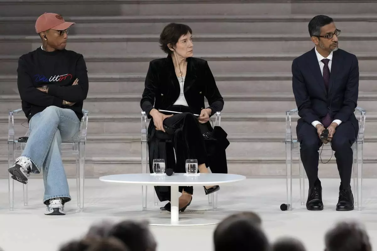 Musician and fashion designer Pharrell Williams, center, speaks on a panel at the Grand Palais during the Artificial Intelligence Action Summit in Paris, Tuesday, Feb. 11, 2025. (AP Photo/Michel Euler)