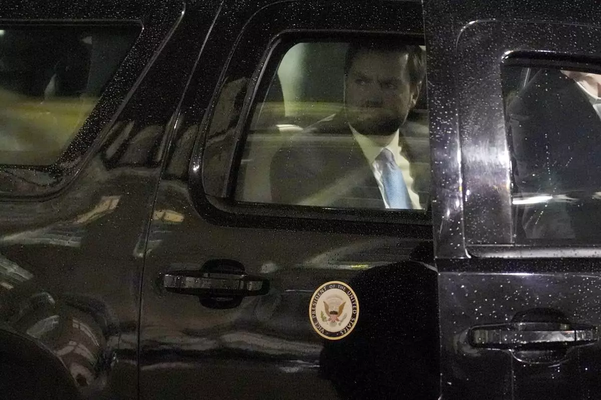 United States Vice-President JD Vance looks out of the car window as he arrives for a dinner at the Elysee Palace, during an event on the sidelines of the Artificial Intelligence Action Summit in Paris, Monday, Feb. 10, 2025. (AP Photo/Aurelien Morissard)