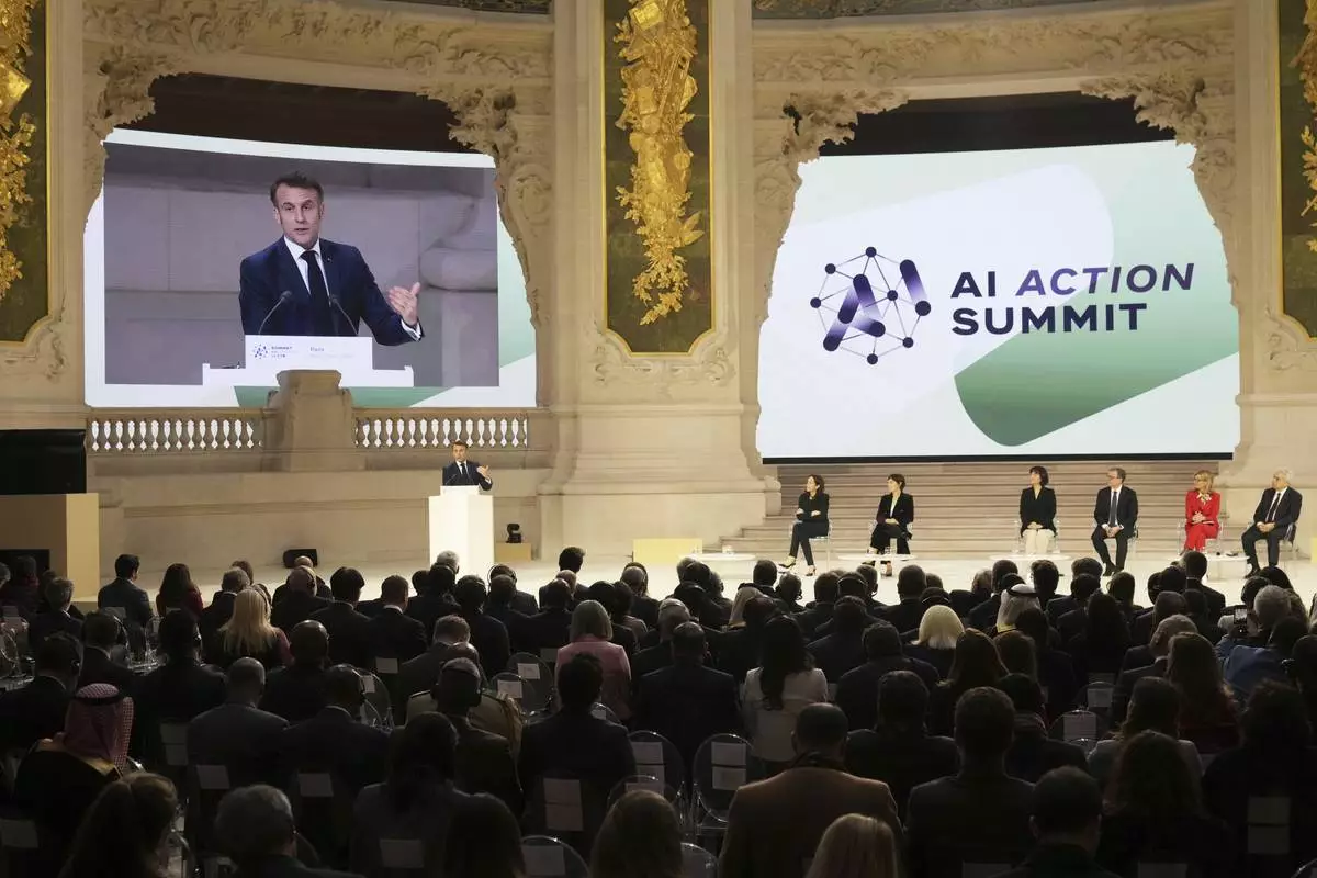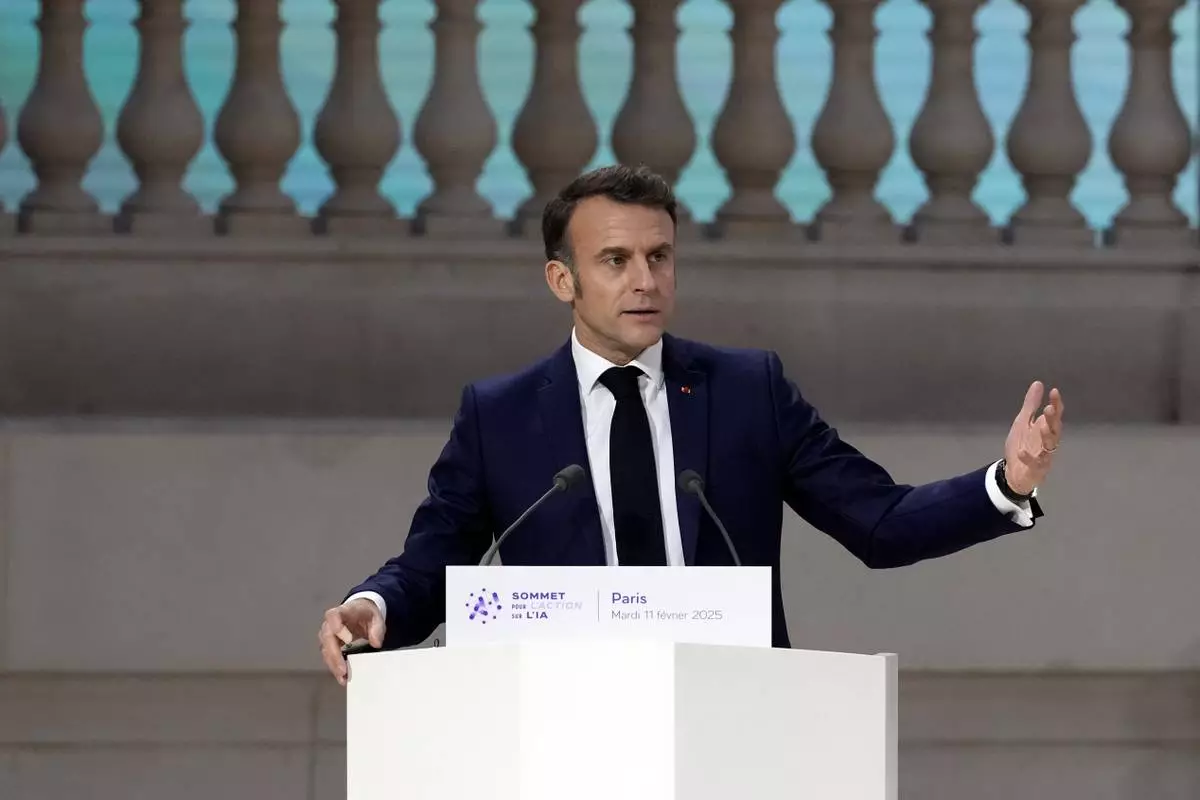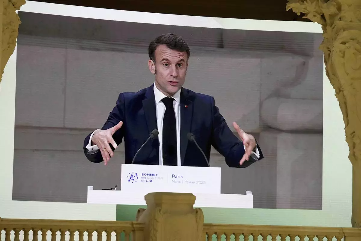 French President Emmanuel Macron addresses the audience in a closing speech at the Grand Palais during the Artificial Intelligence Action Summit in Paris, Tuesday, Feb. 11, 2025. (AP Photo/Michel Euler)