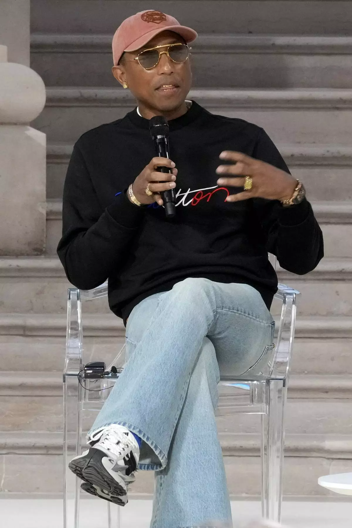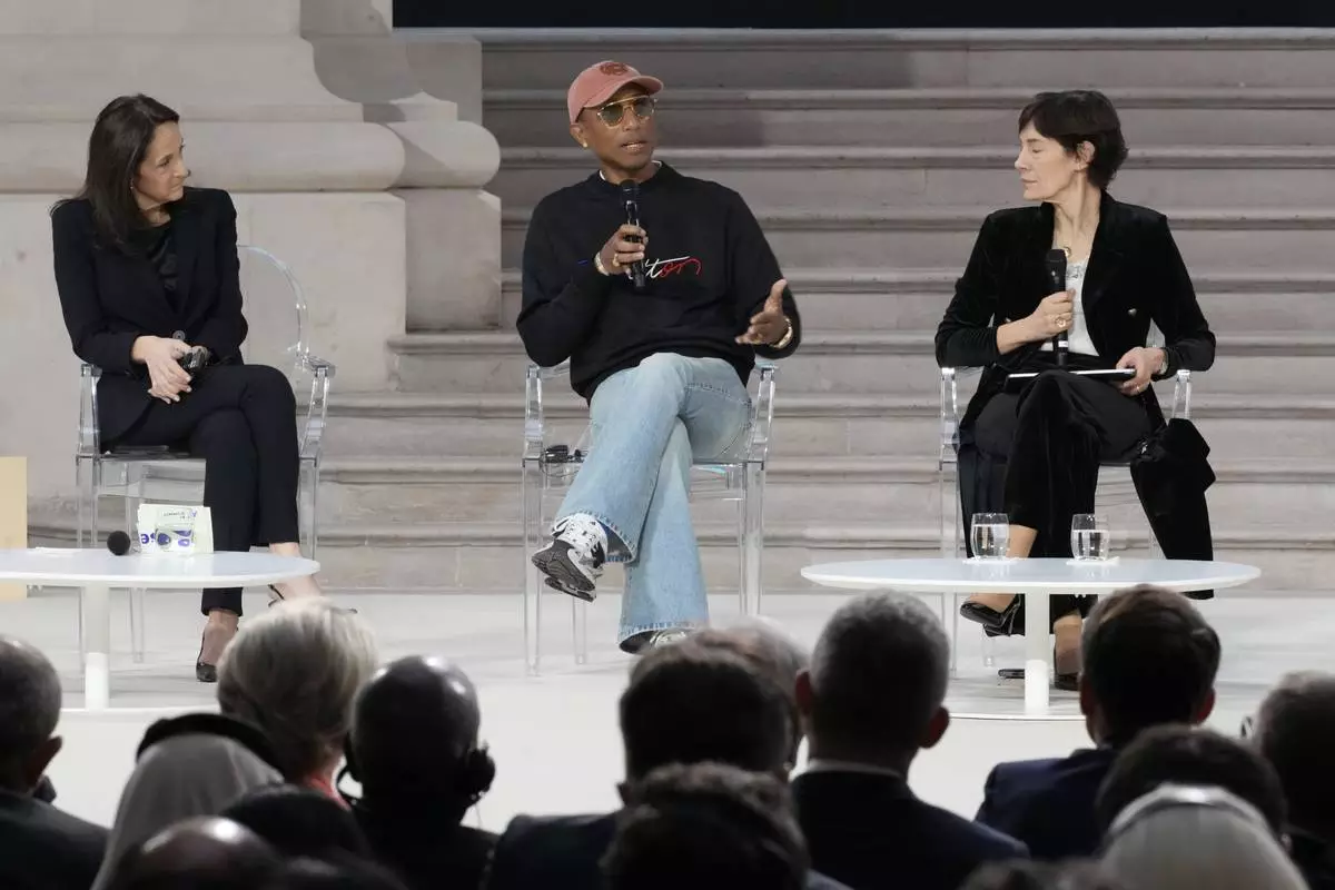 Musician and fashion designer Pharrell Williams speaks on a panel at the Grand Palais during the Artificial Intelligence Action Summit in Paris, Tuesday, Feb. 11, 2025. (AP Photo/Michel Euler)