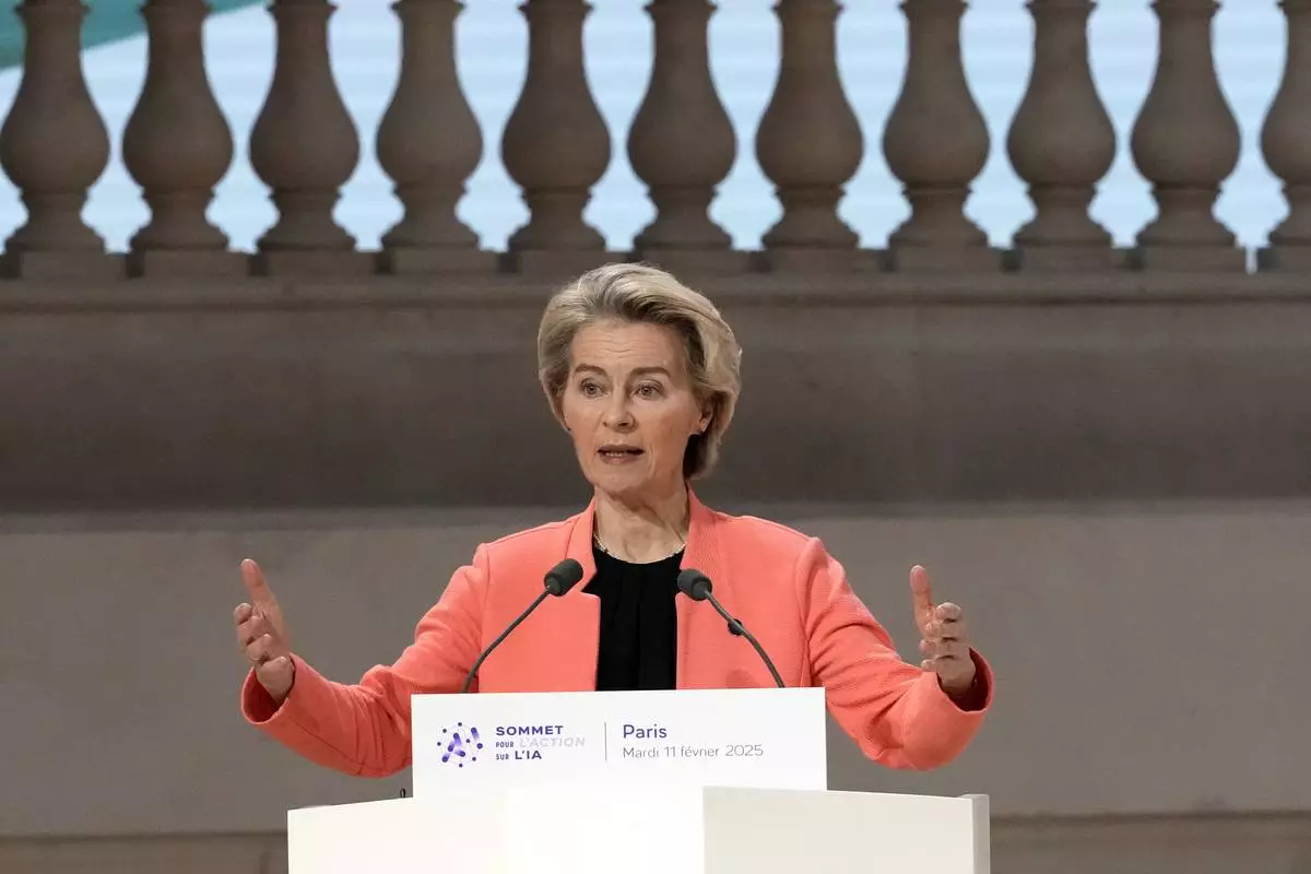 European Commission President Ursula von der Leyen addresses the audience at the Grand Palais during the Artificial Intelligence Action Summit in Paris, Tuesday, Feb. 11, 2025. (AP Photo/Michel Euler)