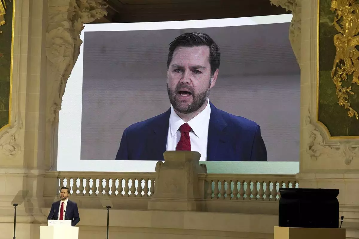 United States Vice-President JD Vance addresses the audience at the Grand Palais during the Artificial Intelligence Action Summit in Paris, Tuesday, Feb. 11, 2025. (AP Photo/Michel Euler)