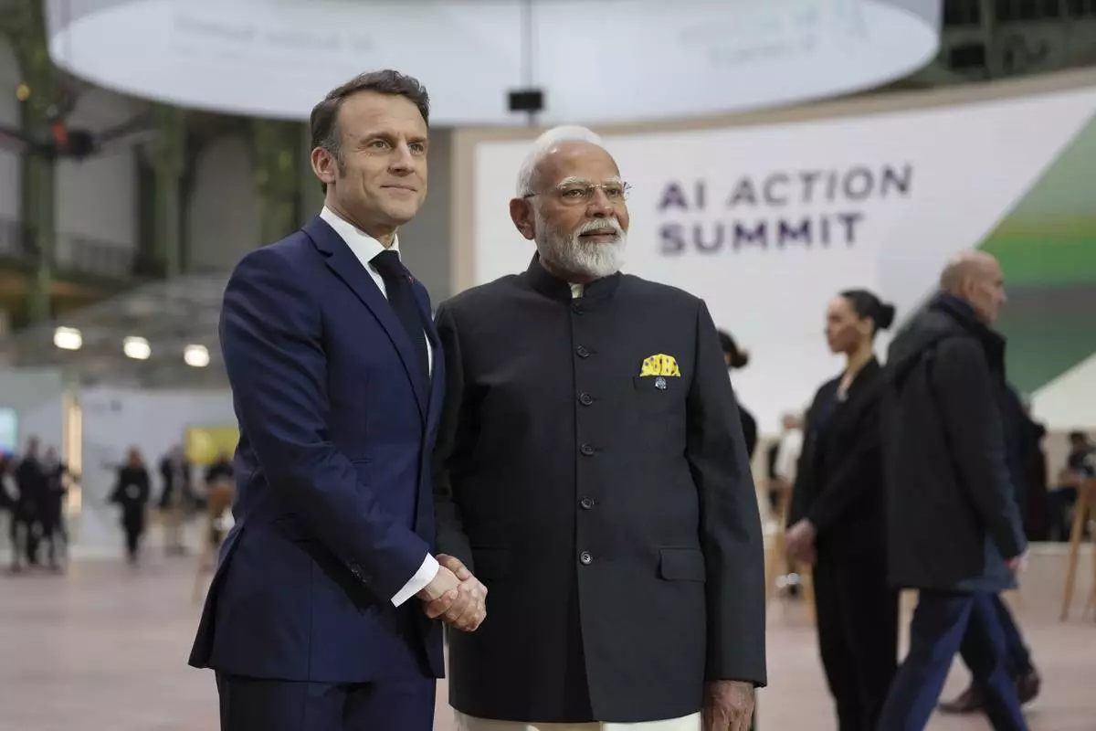 French President Emmanuel Macron, center left, poses with India's Prime Minister Narendra Modi at the Grand Palais during the Artificial Intelligence Action Summit in Paris, Tuesday, Feb. 11, 2025. (AP Photo/Aurelien Morissard)