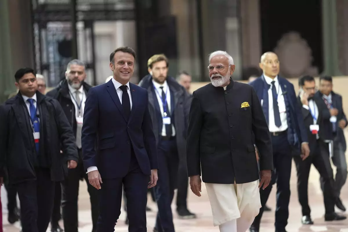 French President Emmanuel Macron, center left, walks with India's Prime Minister Narendra Modi at the Grand Palais during the Artificial Intelligence Action Summit in Paris, Tuesday, Feb. 11, 2025. (AP Photo/Aurelien Morissard)