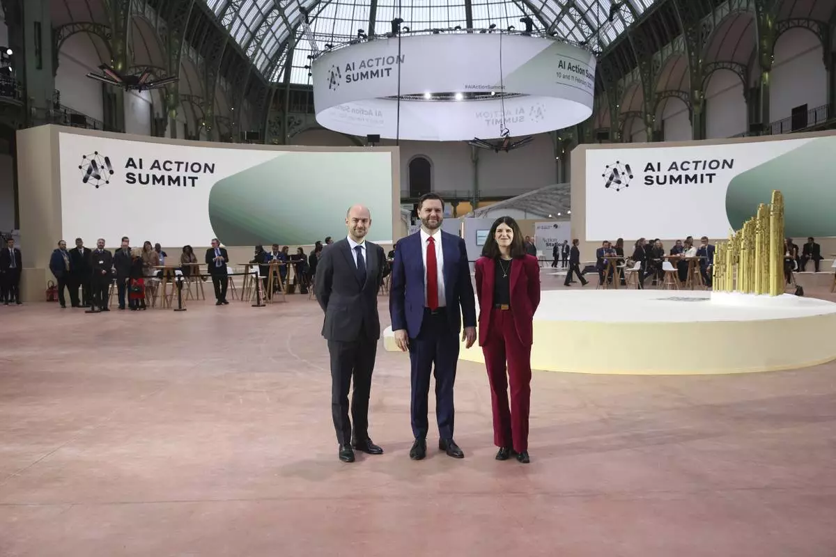 United States Vice-President JD Vance, center, is welcomed by French Foreign Minister Jean-Noel Barrot, left, and French businesswoman Clara Chappaz at the Grand Palais during the Artificial Intelligence Action Summit in Paris, Tuesday, Feb. 11, 2025. (AP Photo/Thomas Padilla)