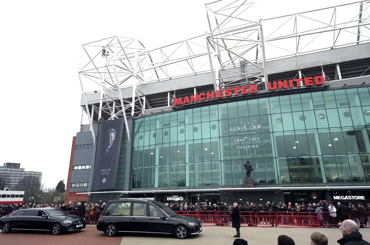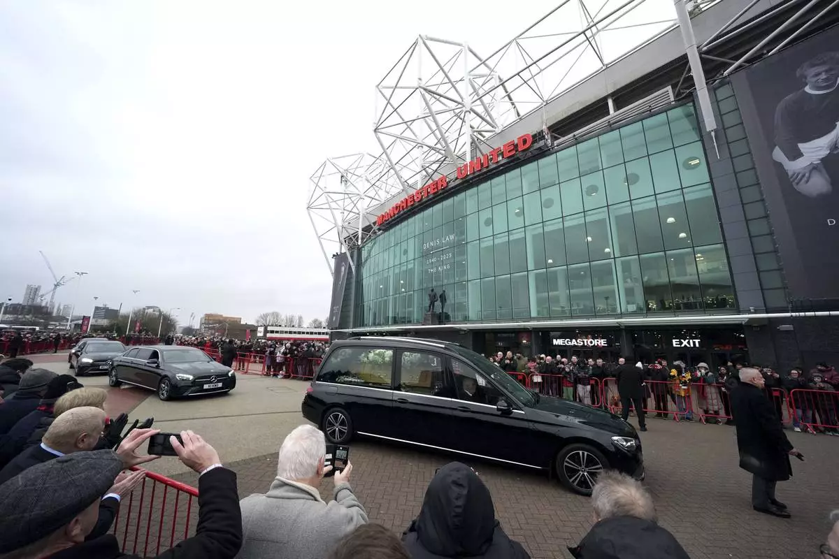 MANCHESTER, England (AP) — Thousands of Manchester United fans gathered at Old Trafford on Tuesday to pay tribute to Denis Law ahead of the club great's funeral.
