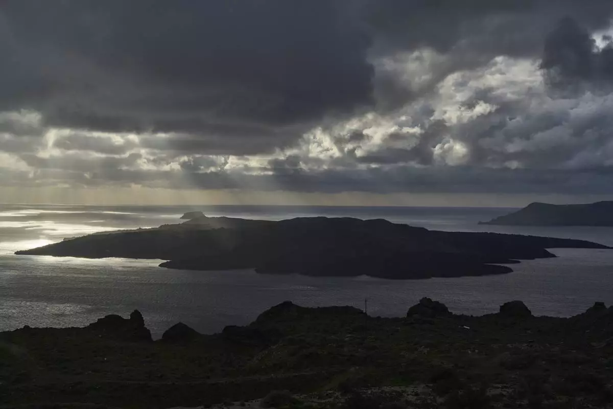 Sun rays illuminate the volcanic islet of Nea Kameni, part of the earthquake-struck island of Santorini, Greece, Tuesday, Feb. 4, 2025. (AP Photo/Petros Giannakouris)