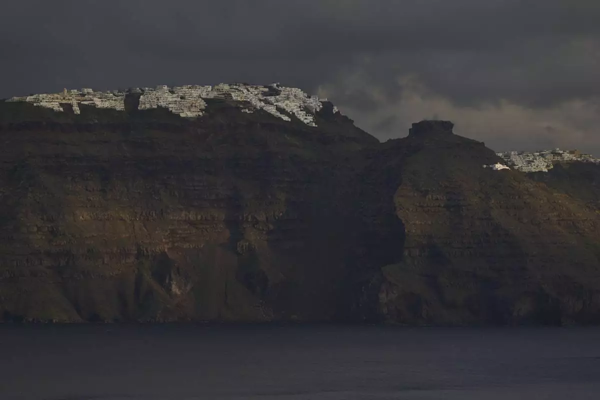 The main town of Fira is seen from across a bay on the earthquake-struck island of Santorini, Greece, Tuesday, Feb. 4, 2025. (AP Photo/Petros Giannakouris)