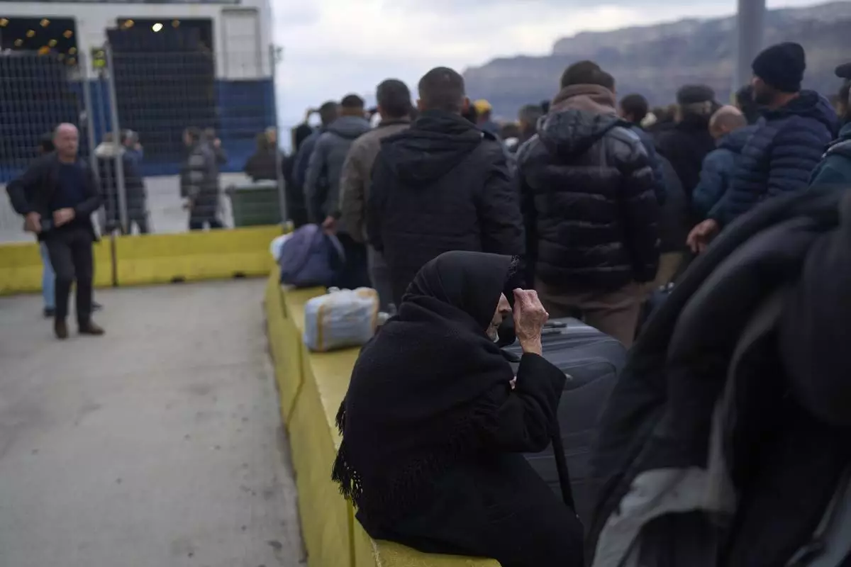 Flora, 94, said she survived a deadly earthquake on Santorini in 1956, as she boards a ferry bound for the Greek mainland, in the earthquake-struck Greek island, Tuesday, Feb. 4, 2025. (AP Photo/Petros Giannakouris)
