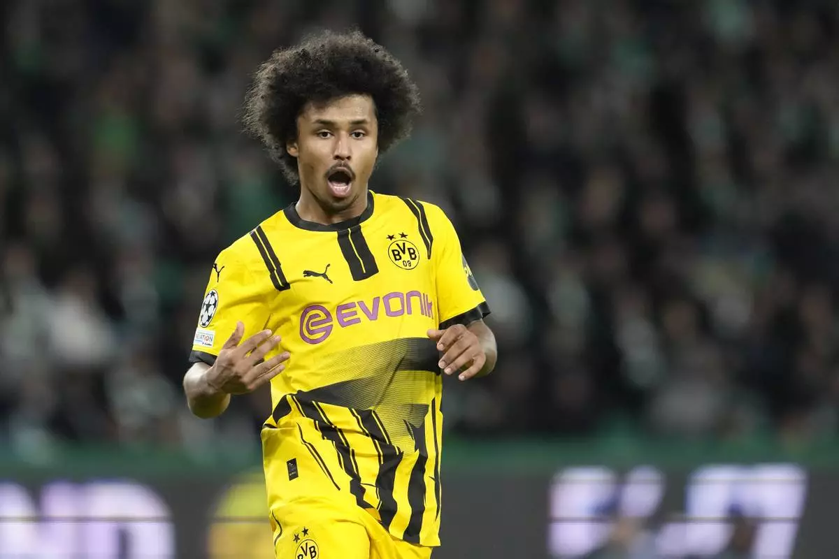 Dortmund's Karim Adeyemi during the Champions League playoff first leg soccer match between Sporting CP and Borussia Dortmund at the Alvalade stadium in Lisbon, Portugal, Tuesday, Feb. 11, 2025. (AP Photo/Armando Franca)