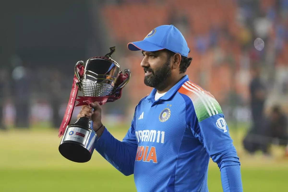 India's captain Rohit Sharma holds the trophy after winning one day international cricket series against England in Ahmedabad, India, Wednesday, Feb. 12, 2025. (AP Photo/ Ajit Solanki )